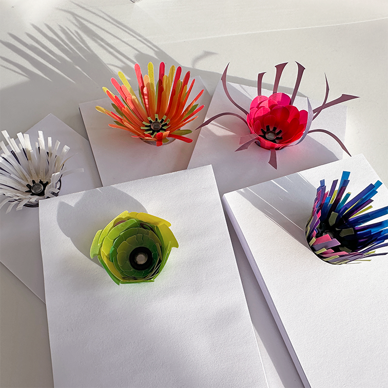 Der Papierstapel wird vom Motiv zusammengehalten, über das die perforierten Blätter abgehoben werden. Je tiefer der Stapel, desto mehr öffnet sich die Blüte.